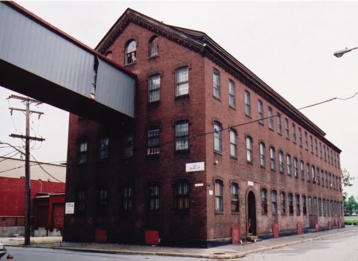 “The oldest building in this complex is the much altered 2-story, monitor roofed, frame building in the center of the block on Perkins Street, built between 1849 and 1857. The main building, constructed in 1865 from plans by Spencer R. Read, is a handsome, gable roofed, brick structure with corbelled brick cornices, brick window caps, and arched door surrounds. This building, fronting on Pearl Street, was originally used for machining and assembling. A long, brick two-story wing built at the same time behind the main building was later raised to three stories. Although this building has window caps identical to the main building, it may incorporate an older structure. In 1951 a large, flat one-story glass and brick structure replaced the foundry on Perkins and Rice Streets.
